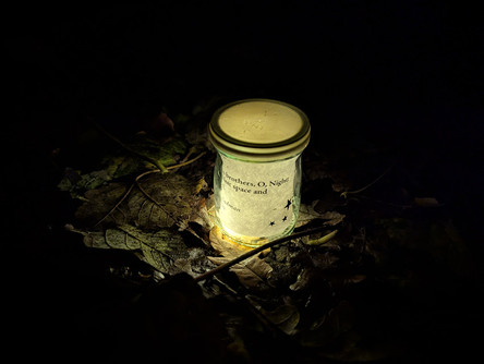 Walking together into the dark woodland with minimal light, a natural procession formed. We entered the clearing after a few minutes and slowly found seats on chairs and tree stumps, with candle poetry lanterns scattered over the forest floor to gently light us up.